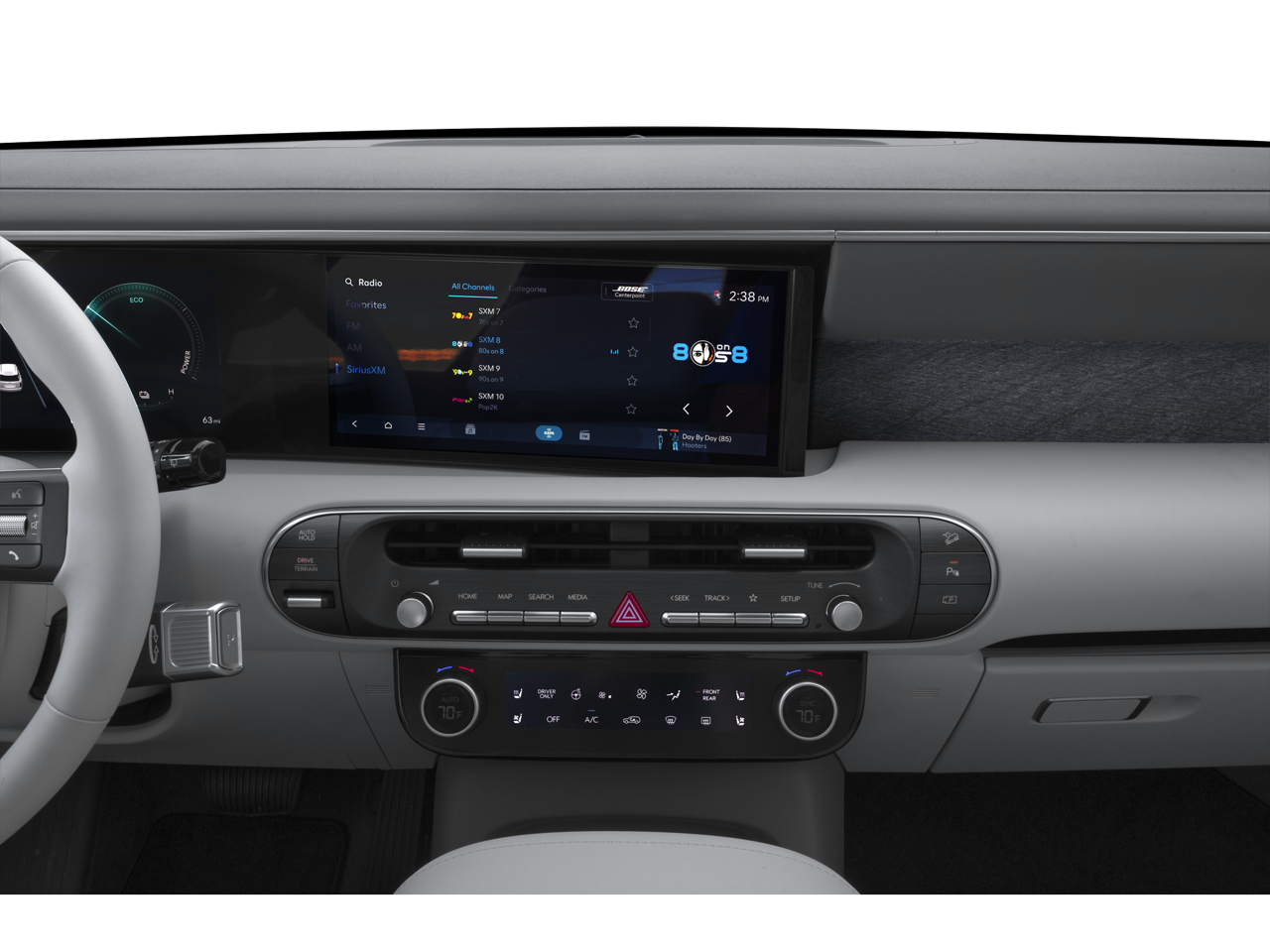 - Radio: Infotainment Navigation System -inc: Bose 14-speaker premium audio system w/Centerpoint and SoundTrue enhanced technology, 12.3" color touchscreen, wireless Apple CarPlay and Android Auto, HD Radio, Sirius XM, Passenger Talk 2.0 in-car intercom system, dynamic voice recognition, rear seat quiet mode, Bluetooth® hands-free w/wireless audio streaming, multiple device connection (up to 2 devices), USB connectivity, Bluelink + connected car services, Wi-Fi hotspot, steering wheel audio controls and Over-the-Air (OTA) software updates