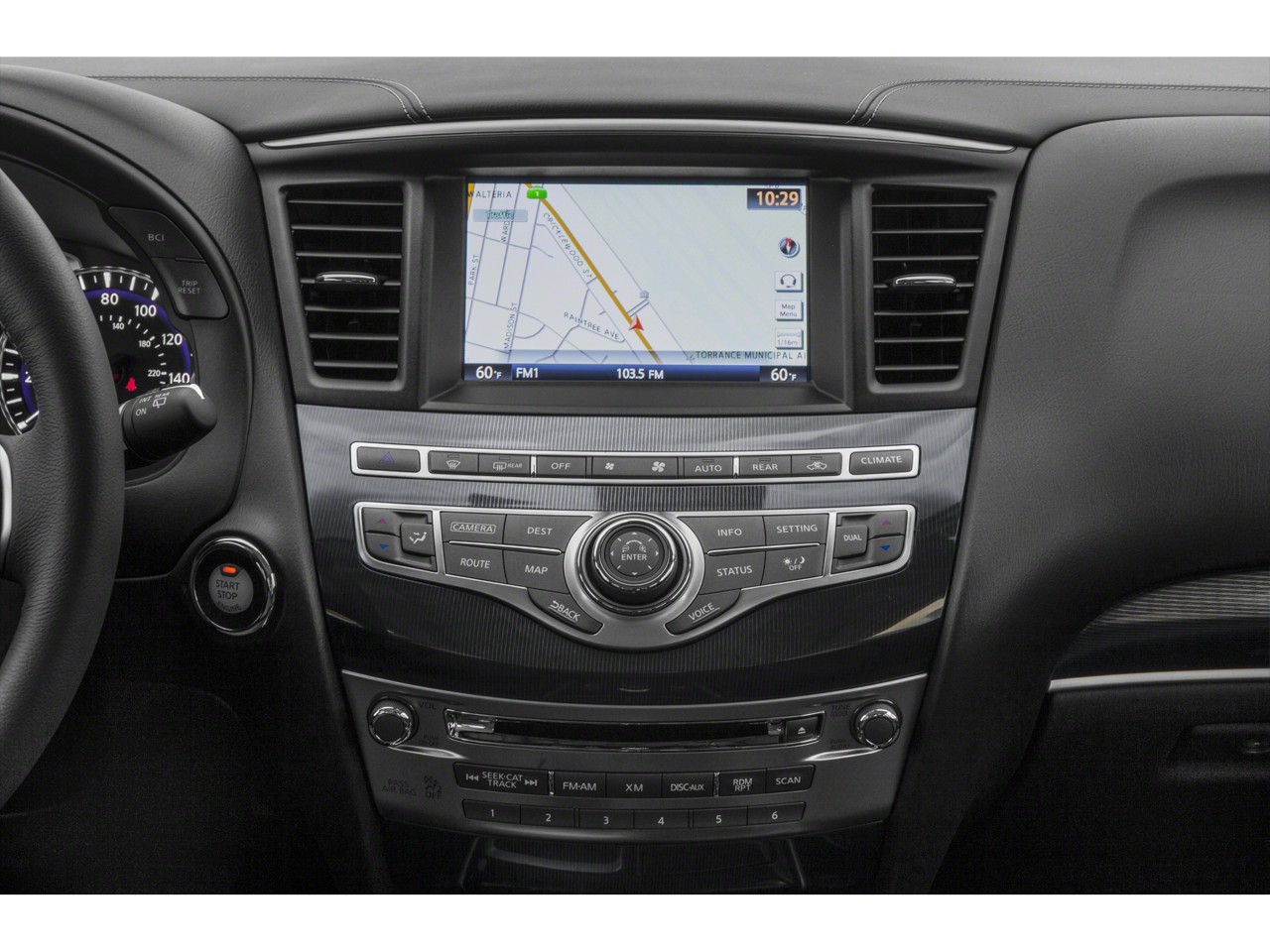 - Radio: AM/FM/CD/MP3 w/Bose Premium Audio System -inc: 13 speakers, navigation, 2 A/V USB ports, Radio Data System (RDS), speed-sensitive volume controls, auxiliary A/V input jacks, 12-volt power outlet in front center console and INFINITI InTouch w/8" color touch-screen display, voice recognition, Bluetooth® hands-free phone system, Bluetooth® audio streaming, SiriusXM Satellite Radio and SiriusXM Travel Link